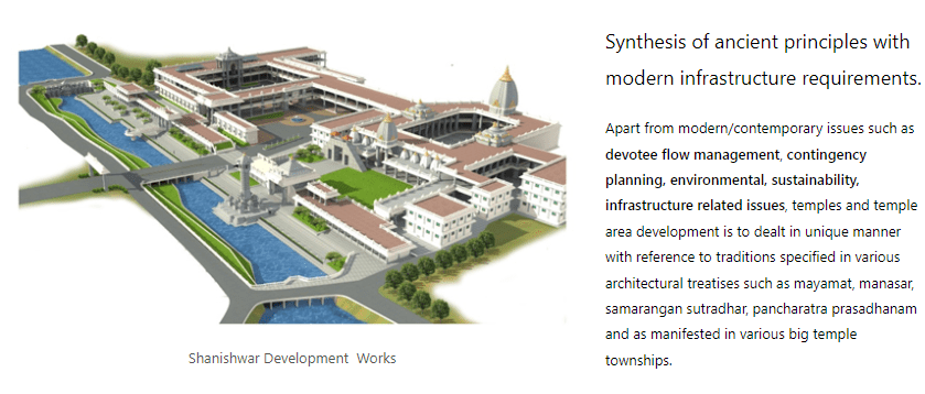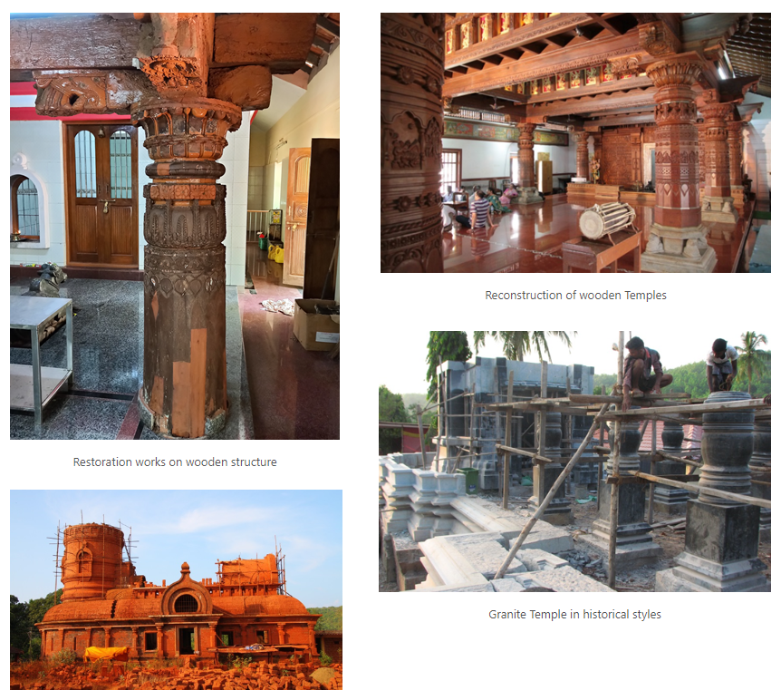 The work varies from repairs,restoration to development of tourism and pilgrim related facilities with Directorate of Archives & Archaeology.The work ranging from repair,restoration,renovation and reconstruction with traditional elements and design principles of vasthushastra from sthapatya (architecture) to pratima vidhanam/shilpa-chitra tradtions(iconography & arts).